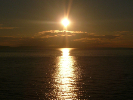 Západ slunce na lodi z ostrova Victoria směrem do Vancouveru v západní Kanadě.